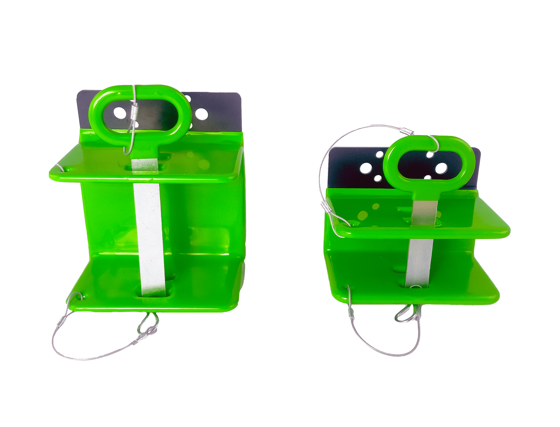 This kit features two distinct mounting brackets. One side has a larger opening to perfectly accommodate the thicker handle or engine end, while the other side has a narrower opening for the thinner shaft end. This ensures a snug and secure fit along the tool's entire length.